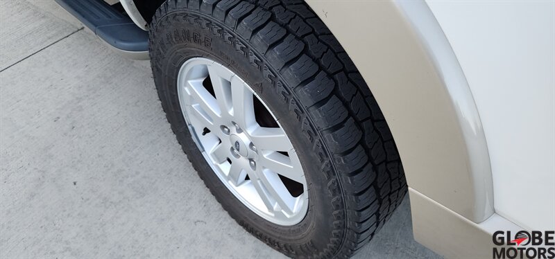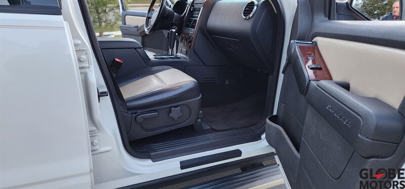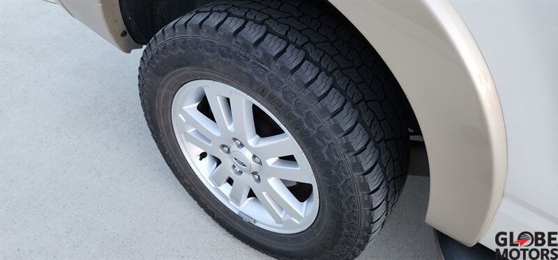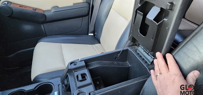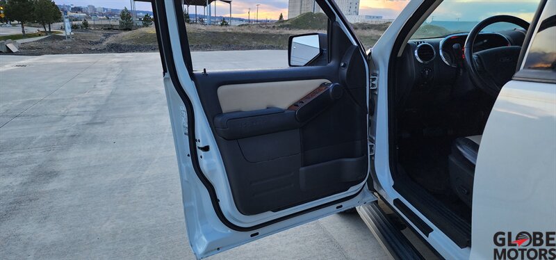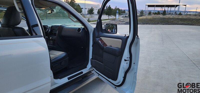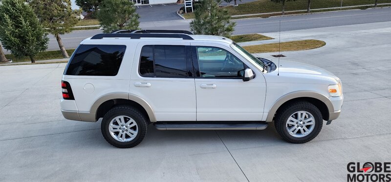 2010 Ford Explorer Eddie Bauer AWD in White Platinum Metallic Tri-Coat with Camel leather interior. Powered by a 4.0L V6 (210 hp, 254 lb-ft) paired with a 5-speed automatic and all-wheel drive. Factory equipment includes leather-trimmed heated front seats with power adjustments, two-tone Camel leather and wood-grain interior accents, remote keyless entry, power windows/locks/mirrors, cruise control and steering-wheel audio controls, AM/FM/CD audio with auxiliary input, dual-zone automatic climate control, roof rails and running boards, alloy wheels and fog lamps. Safety and convenience features include ABS, stability and traction control, multiple airbags and tire pressure monitoring. Below 121,000 miles (avg <8,000/yr), excellent overall condition, EPA-rated 13 MPG city / 19 MPG highway, clean CARFAX.
