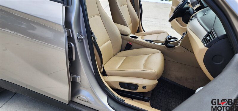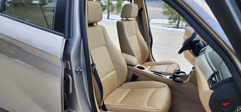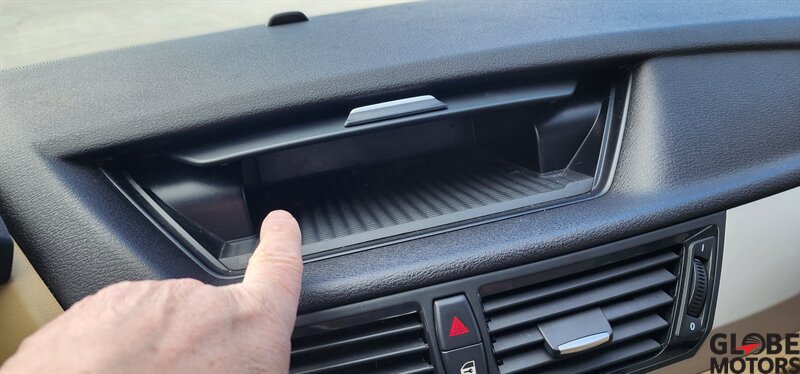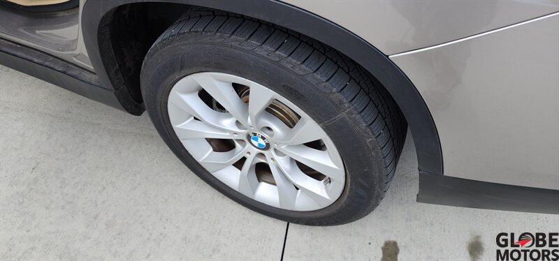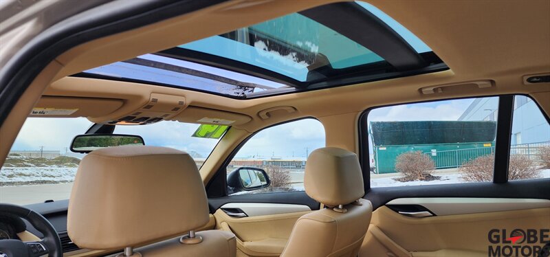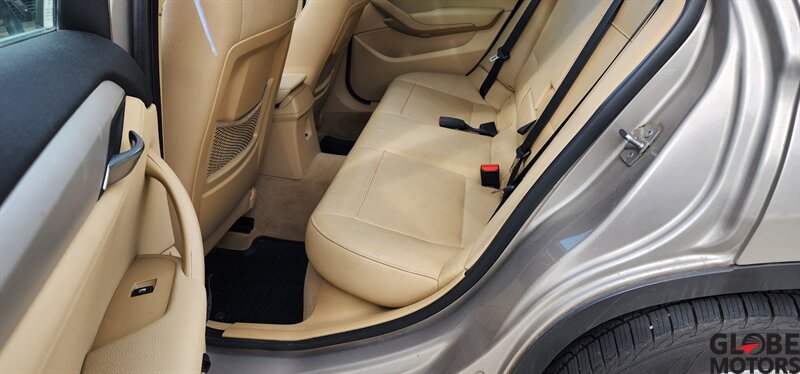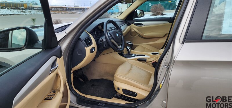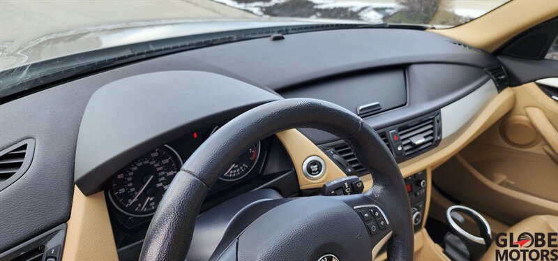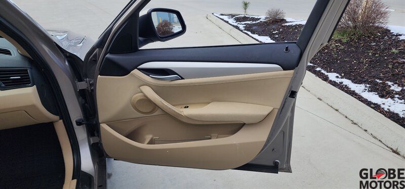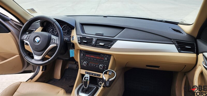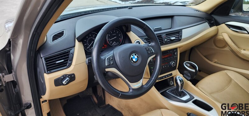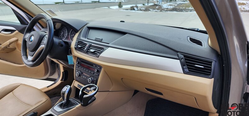 2014 BMW X1 xDrive28i AWD in Glacier Silver Metallic with a Beige leather interior, powered by a 2.0L turbocharged I4 producing 240 hp and 260 lb-ft of torque. Factory equipment includes BMW xDrive all-wheel drive, power windows and locks, remote keyless entry, cruise control, dual-zone automatic climate control, power-adjustable front seats, 60/40 split rear seats, roof rack and alloy wheels. Infotainment and convenience features include Bluetooth hands-free, USB/AUX inputs, steering-wheel audio and phone controls, AM/FM/CD audio with BMW’s interface, plus standard safety systems such as ABS, stability and traction control, multiple airbags and tire pressure monitoring. This vehicle has good mileage (under 110,000 miles, averaging less than 9,000 miles/year) and a clean CARFAX.