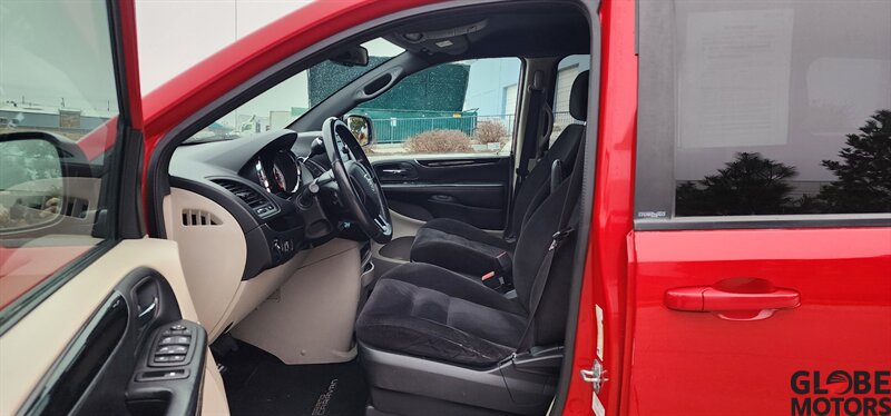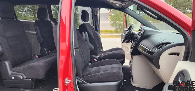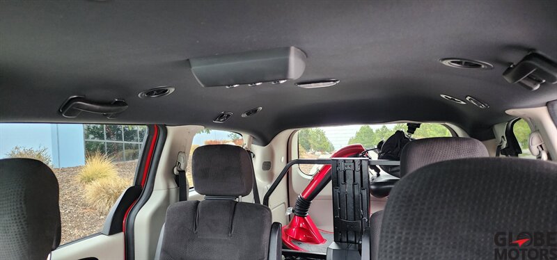 2014 Dodge Grand Caravan SE 30th Anniversary with the Pentastar 3.6L FlexFuel V6 (283 hp, 260 lb-ft) and six-speed automatic. Exterior is Deep Cherry Red Crystal Pearl Coat with a Black cloth/faux suede interior. This van is mobility-ready and includes a rear mobility scooter lift and a matching mobility scooter—a rare package that can save a buyer significant money compared to purchasing them separately.