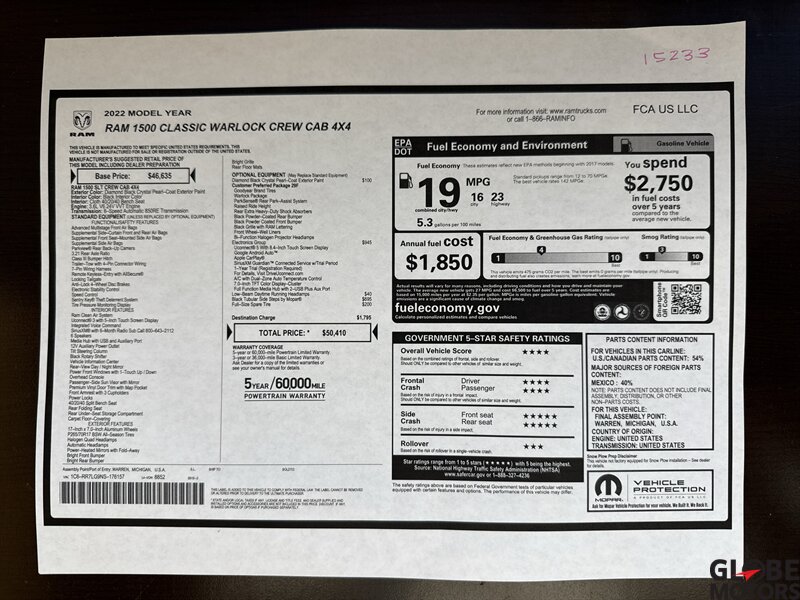 2015 RAM 1500 Outdoorsman, a versatile pickup designed for both work and play. Powered by a robust 3.0L EcoDiesel Biodiesel Turbo V6 engine, it delivers 240 horsepower and 420 ft-lbs of torque, ensuring impressive towing and hauling capabilities. The exterior is finished in a striking Holland Blue, while the interior features a stylish Black-and-Gray combination, providing a comfortable, functional cabin.