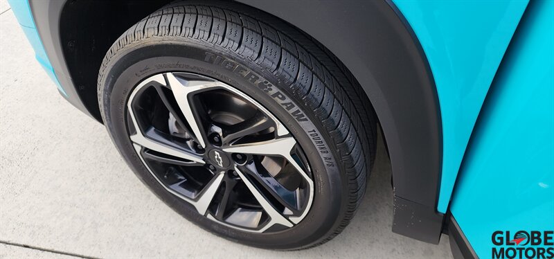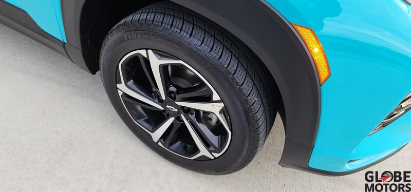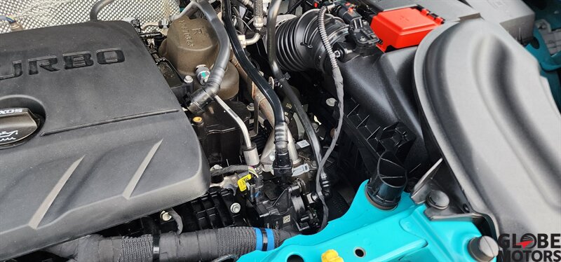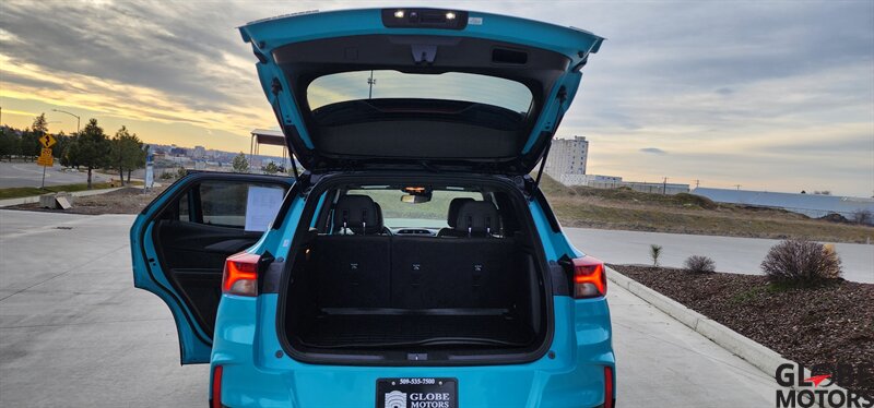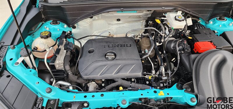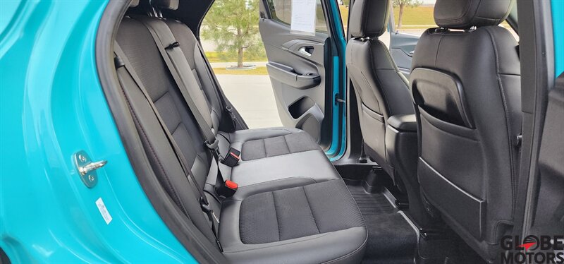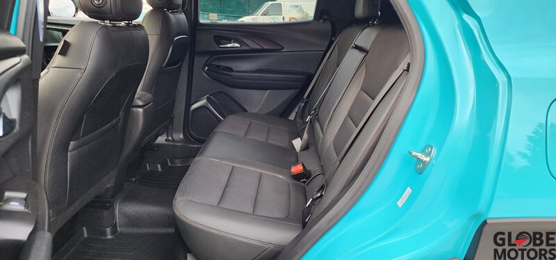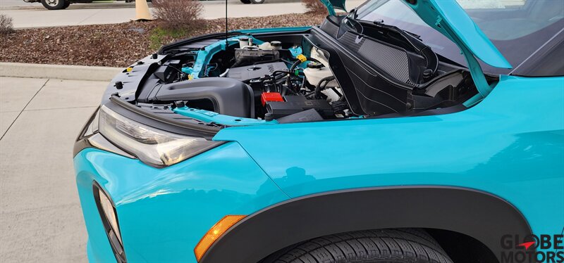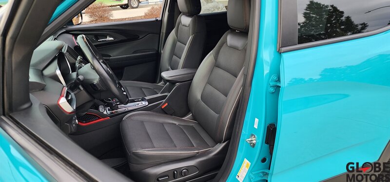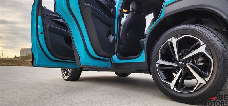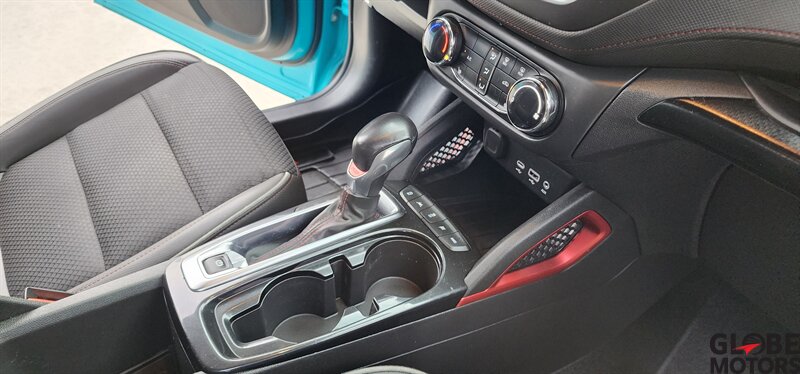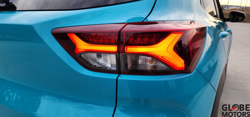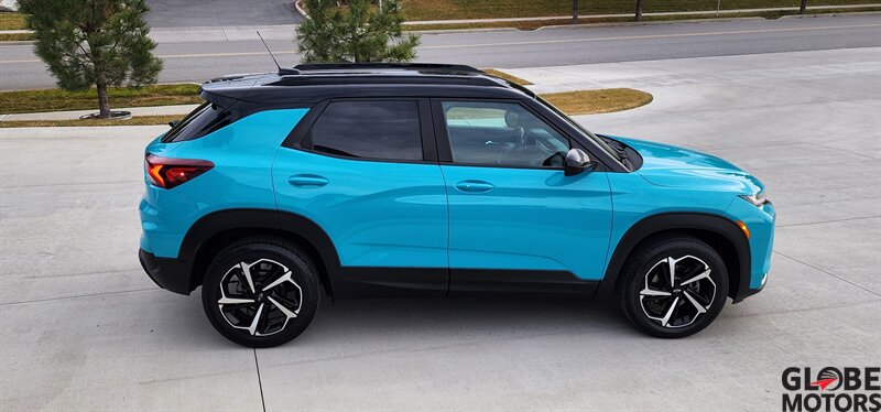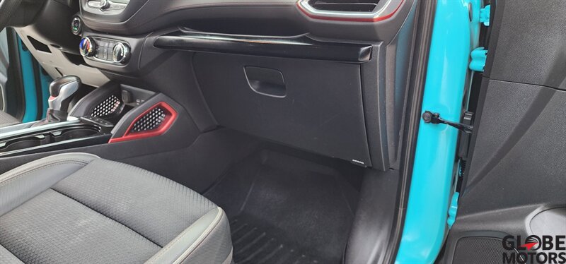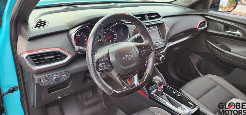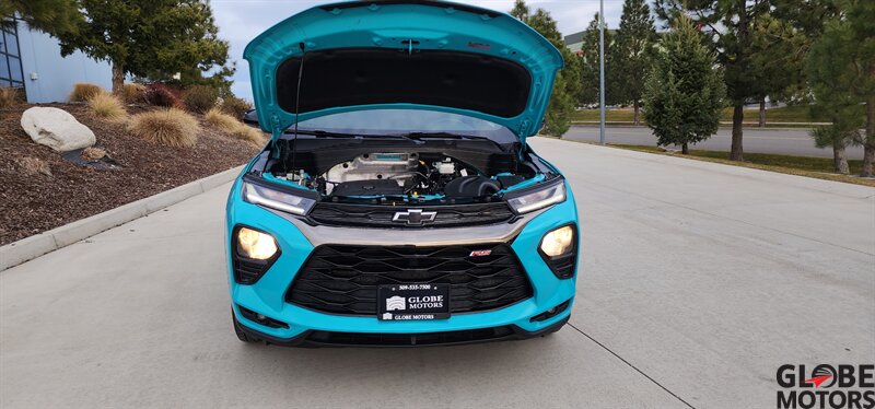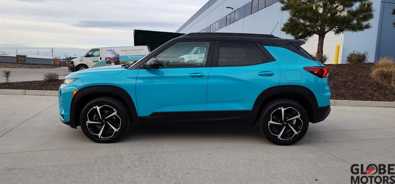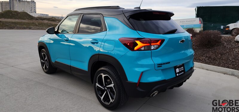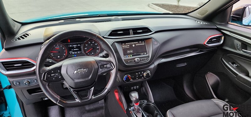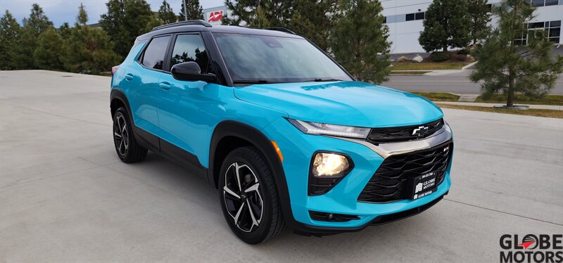 2022 Chevrolet Trailblazer RS 4WD in Oasis Blue with Jet Black/Red Accent leather, powered by an ECOTEC 1.3L Turbo I3 (155 hp / 174 lb-ft). Factory-equipped RS features include the sport appearance package with unique RS badging and black exterior accents, alloy wheels, rear spoiler and signature LED lighting; leather-appointed seats with red contrast accents and a leather-wrapped steering wheel; and versatile cargo space with 60/40 split-folding rear seats. Standard technology and convenience features include Chevrolet Infotainment with smartphone integration (Apple CarPlay/Android Auto), Bluetooth, multiple USB ports and a rear vision camera. Safety features include Chevrolet Safety Assist technologies such as forward collision alert with automatic emergency braking, lane keep assist with lane departure warning, following distance indicator and IntelliBeam auto high beams. EPA-estimated fuel economy is 26 MPG city / 30 MPG highway. Clean CARFAX.