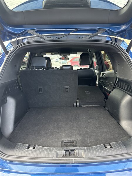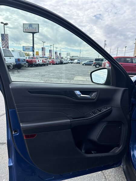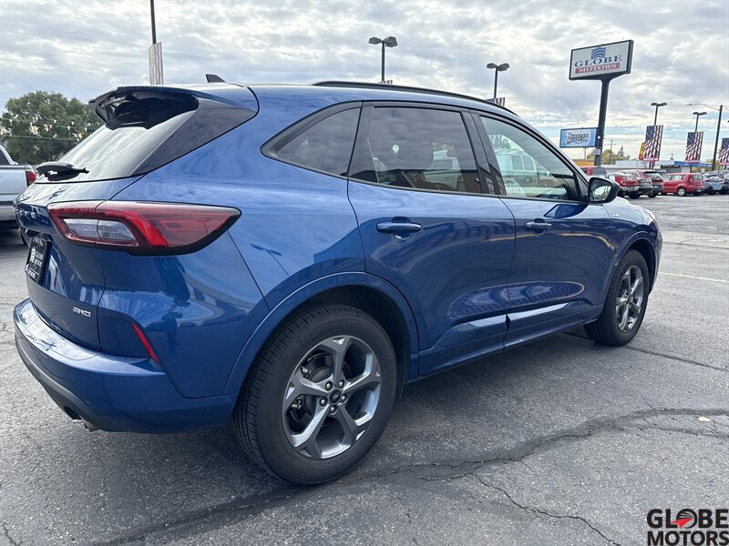 2023 Ford Escape ST-Line AWD, a dynamic compact SUV that combines style and performance. Powered by a responsive EcoBoost 1.5L Turbo I3 engine, it delivers 180 horsepower and 199 ft-lbs of torque, ensuring an engaging driving experience. The Atlas Blue exterior is complemented by an elegant Ebony interior featuring striking red contrast stitching, providing a modern and sporty ambiance.